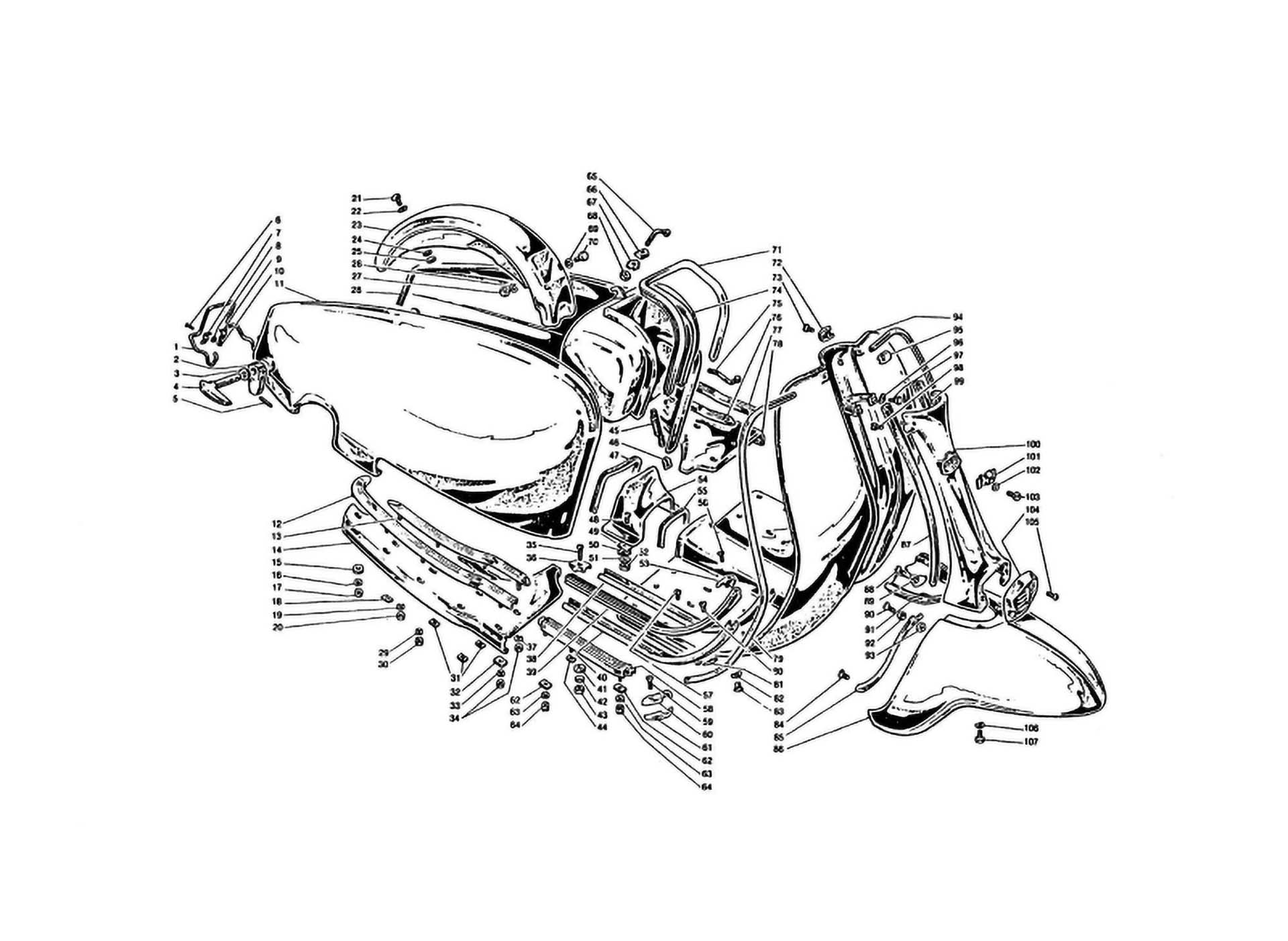 Body. In this section you will find all body parts for Lambretta LI125, LI150, TV175, TV200, 125 Special, SX150, SX200, DL125, DL150, DL200 & GP125, GP150 & GP200 models from years 1959 until 1971. You will find parts such as number plate holders,  body gaskets, body fixings, legshield trim, side panel trim, side panel handles, nuts, bolts, washers, floor channels, floor end caps, floor rubber, floor kits, floor plastics, legshield end caps, rear frame grills, horn grills, side panel buffers, legshield end caps, sharks teeth & horncast badge clips.